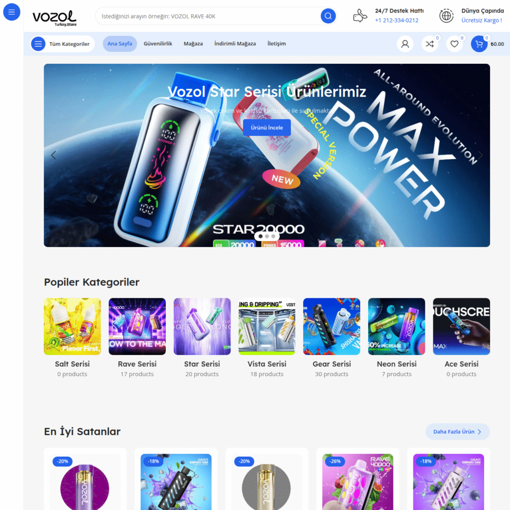 Ajansımız tarafından geliştirilen Vozol Türkiye Mağazası, kullanıcı deneyimini en üst düzeye çıkaracak şekilde tasarlanmış modern bir e-ticaret platformudur. Site altyapısı, LiteSpeed optimizasyonu ile hızlandırılmış olup, tüm SEO içerikleri ve geliştirmeleri ajansımız tarafından özenle hazırlanmıştır. Kullanıcıların mobil, tablet ve masaüstü cihazlarda sorunsuz alışveriş yapabilmesi için responsive tasarım uygulanmıştır.
